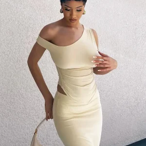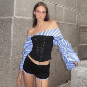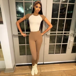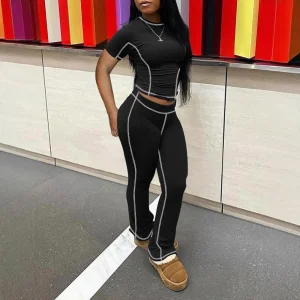 Women Fashion Casual Contrast Color Slim-Fit Short-Sleeeve T-Shirt High Waist Pants Two-Piece Set
