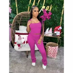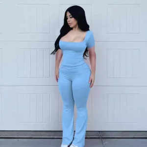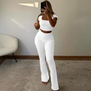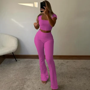 Women Fashion Casual Contrast Color Slim-Fit Short-Sleeeve T-Shirt High Waist Pants Two-Piece Set